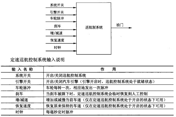 某公司欲开发一个车辆定速巡航控制系统,以确保车辆在不断变化的地形中以固定的速度行驶。该系统的简化示意图如下图所示。各种系统输入的含义见下表。