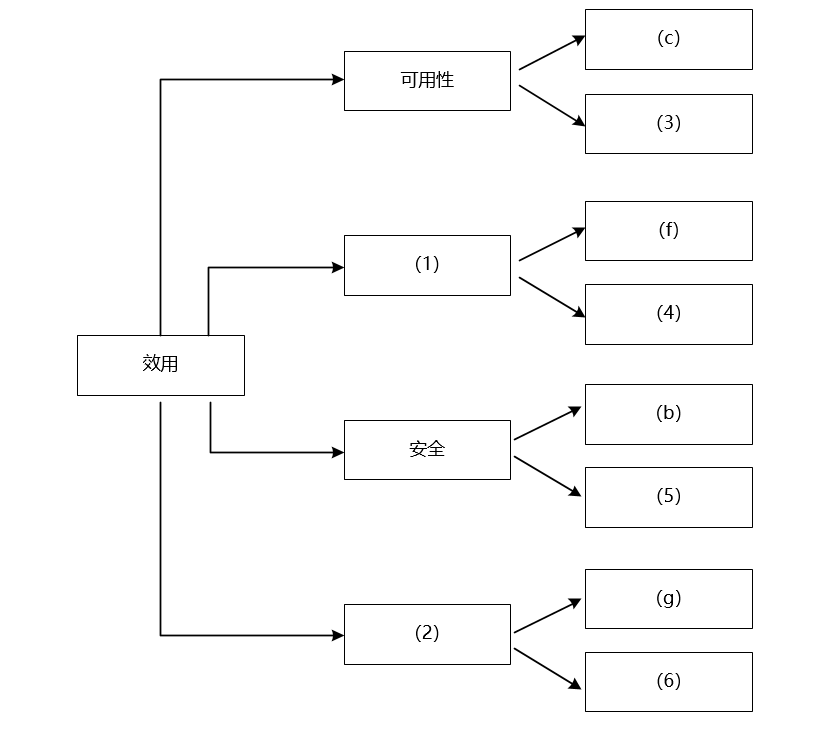 在架构评估过程中,质量属性效用树(utility tree)是对系统质量属性进行识别和优先级排序的重要工具。 请将合适的质量属性名称填入图1-1中(1)、(2)空白处,并从题干中的(a)-(i)中选择合适的质量属性描述,填入(3)-(6)空白处,完成该平台的效用树。
