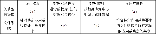 请从设计难度、数据冗余程度、数据架构、应用扩展性等4个方面对关系型数据库管理系统和文件系统两种数据存储方式进行比较,填写表4-1中(1)~(4)。 表4-1 关系型数据库管理系统和文件系统存储方式比较