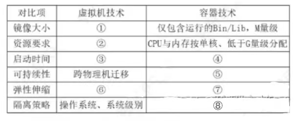 表3-1给出了虚拟技术和容器技术的性能对比表,请根据下面的(a)~(h)的8个性能指标,判断这些指标属于哪类对比项,补充完善 3-1的(1)~(8)的空白处。