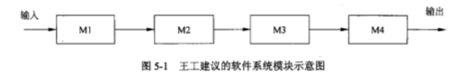 某软件公司开发一项基于数据流的软件,其系统的主要功能是对输入的数据进行多次分析、处理和加工,生成需要的输出数据。需求方对该系统的软件可靠性要求很高,要求系统能够长时间无故障运行。该公司将该系统设计交给王工负责。王工给出该系统的模块示意图,如图5-1所示。王工解释:只要各个模块的可靠度足够高,失效率足够低,则整个软件系统的可靠性是有保证的。
