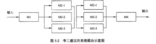 李工认为,应该在软件系统中采用冗余技术中的动态冗余或者软件容错的N版本程序设计技术,对容易失效或者非常重要的模块进行冗余设计,将模块之间的串联结构部分变为并联结构,来提高整个软件系统的可靠性。同时,李工给出了采用动态冗余技术后的软件系统模块示意图,如图5-2所示。