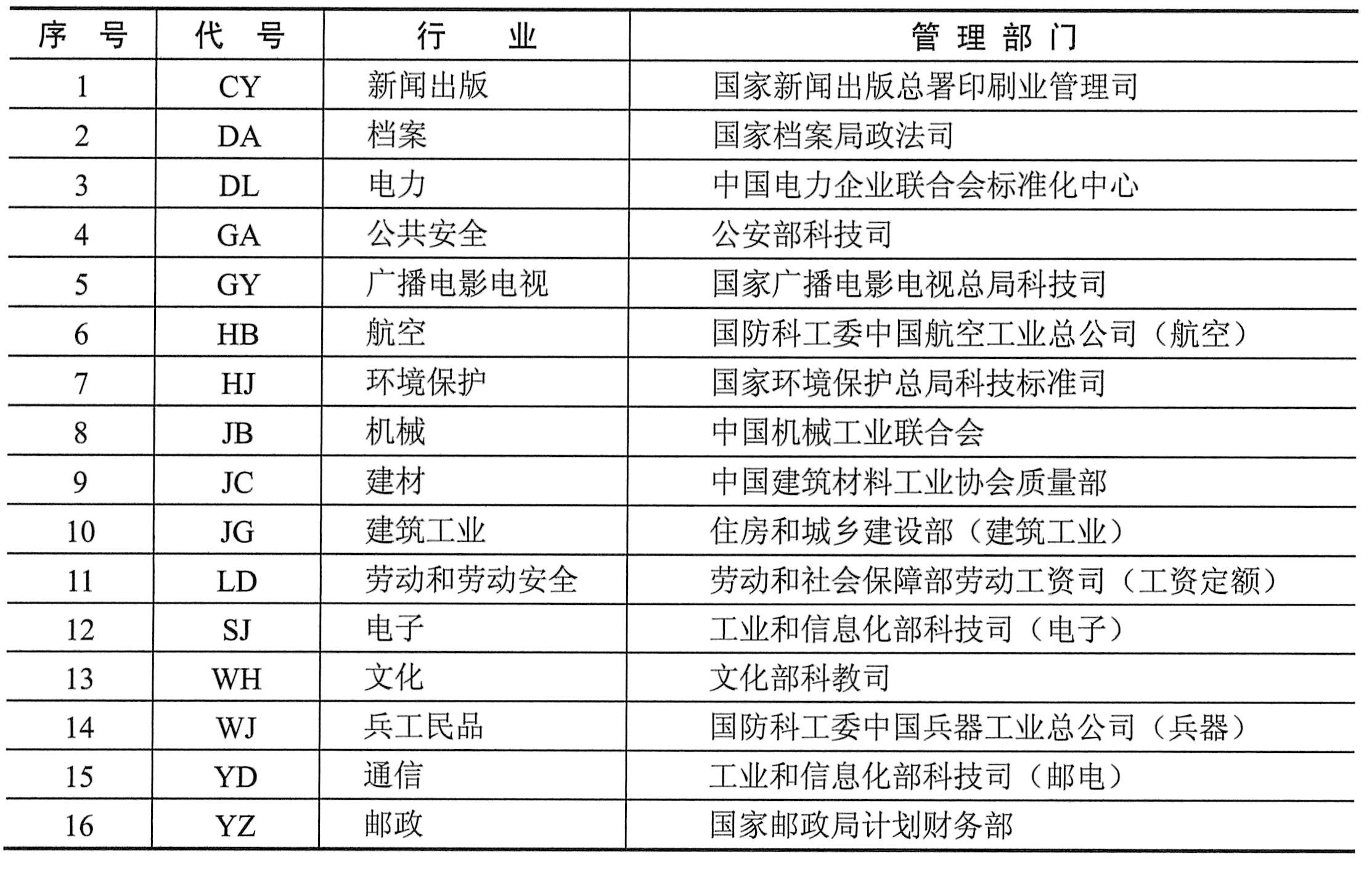 行业标准代号由汉字拼音大写字母组成。行业标准的编号由行业标准代号、标准发布顺序及标准发布年代号(四位数)组成。行业标准也分为强制性和推荐性标准。下表中给出的是强制性行业标准代号,推荐性行业标准的代号是在强制性行业标准代号后面加“/T”,例如农业行业的推荐性行业标准代号是NY/T。