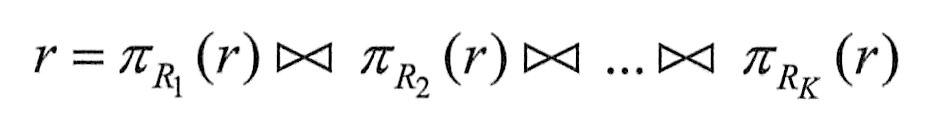 无损联接分解的形式定义如下:设R是一个关系模式,F是R上的一个函数依赖(FD)集。R分解成数据库模式δ={R1,…,RK}。如果对R中每一个满足F的关系r都有下式成立: