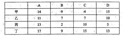 甲、乙、丙、丁4人加工A、B、C、D四种工件所需工时如下表所示。指派每人加工一种工件,四人加工四种工件其总工时最短的最优方案中,工件B应由( )加工。