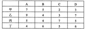 某企业准备将四个工人甲、乙、丙、丁分配在A、B、C、D四个岗位。每个工人由于技术水平不同,在不同岗位上每天完成任务所需的工时见下表。适当安排岗位,可使四个工人以最短的总工时( )全部完成每天的任务。