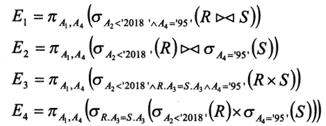 在关系R(A1,A2,A3)和S(A2,A3,A4)上进行关系运算的4个等价的表达式E1、E2、E3和E4如下所示:如果严格按照表达式运算顺序执行,则查询效率最高的是表达式( )。
