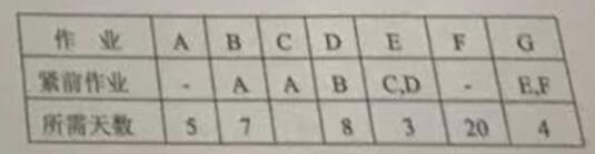 某项目包括A~G七个作业,各作业之间的衔接关系和所需时间如下表: 其中,作业C所需的时间,乐观估计为5天,最可能为14天,保守估计为17天。假设其他作业都按计划进度实施,为使该项目按进度计划如期全部完成。作业C( )。