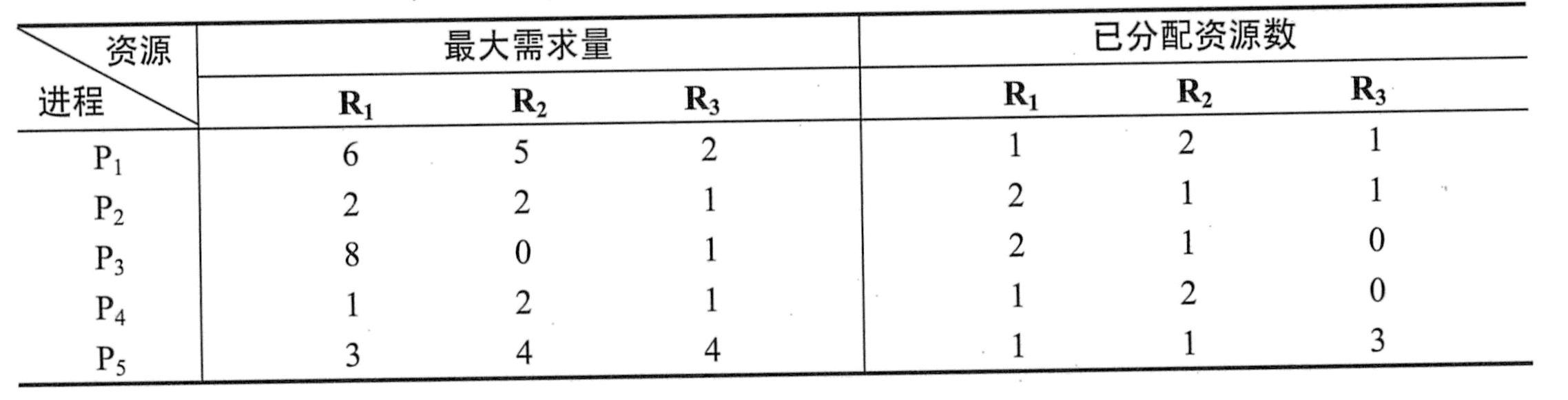 按照P1→P2→P4→P5→P3的顺序执行时,首先执行P1,这时由于其R1、R2和R3的资源数都未分配够,因而开始申请资源,得到还未分配的2个R1,1个R2。但其资源仍不足(没有R3资源),从而进入阻塞状态,并且这时所有资源都已经分配完毕。因此,后续的进程都无法得到能够完成任务的资源,全部进入阻塞,死锁发生了。