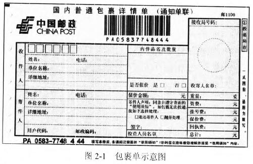 某企业委托软件公司开发一套包裹信息管理系统,以便于对该企业通过快递收发的包裹信息进行统一管理。在系统设计阶段,需要对不同快递公司的包裹单信息进行建模,其中,邮政包裹单如图2-1所示。