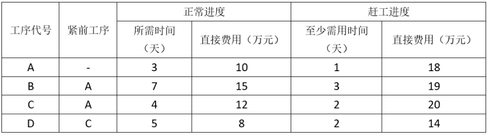 某项目包括A、B、C、D四道工序,各道工序之间的衔接关系。正常进度下各工序所需的时间和直接费用、赶工进度下所需的时间和直接费用如下表所示。该项目每天需要的间接费用为4.5万元。根据此表,以最低成本完成该项目需要()天。