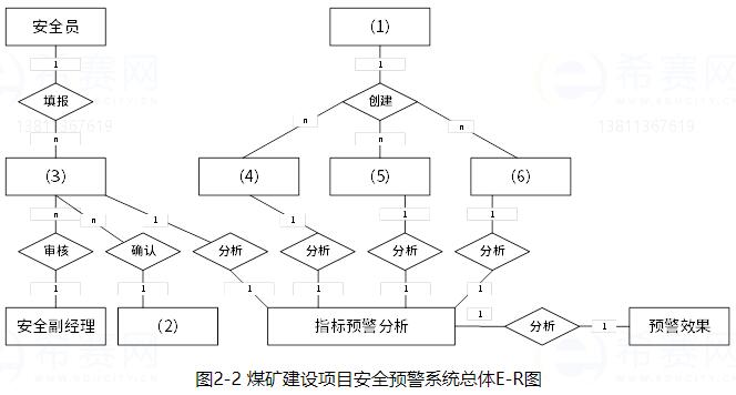请根据【问题1】中数据流图表示的相关信息,补充完善煤矿建设项目安全预警系统总体E-R图(见图2-2)中实体(1)~(6)的具体内容,将正确答案填在答题纸上。