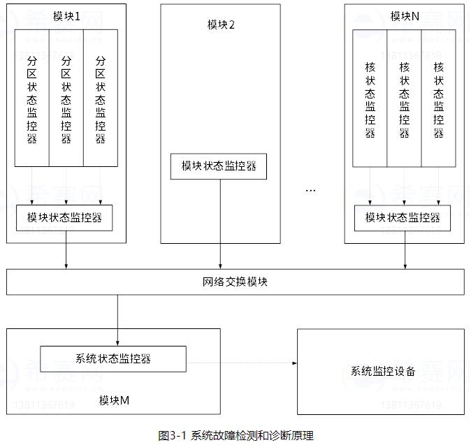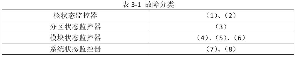 张工针对分布式综合化电子系统的架构特征,给出了初步设计方案,指出每个节点的故障监测与诊断器主要负责监控系统中所有的故障信息,并将故障信息进行综合分析判断,使用故障诊断器分析出故障原因,给出解决方案和措施。系统可以给模块的每个处理机器核配置核状态监控器、给每个分区配置分区状态监控器、给每个模块配置模块状态监控器、给系统配置系统状态监控器,如图3-1所示。