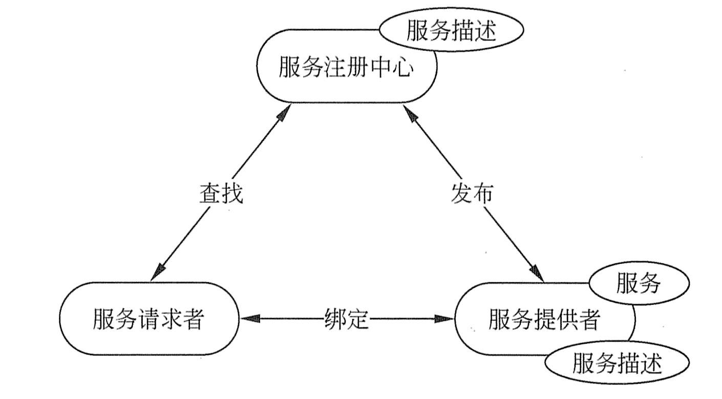 在Web服务模型的解决方案中,一共有3种工作角色,其中服务提供者(服务器)和服务请求者(客户端)是必须的,服务注册中心是一个可选的角色。它们之间的交互和操作构成了Web服务的架构,如下图所示。