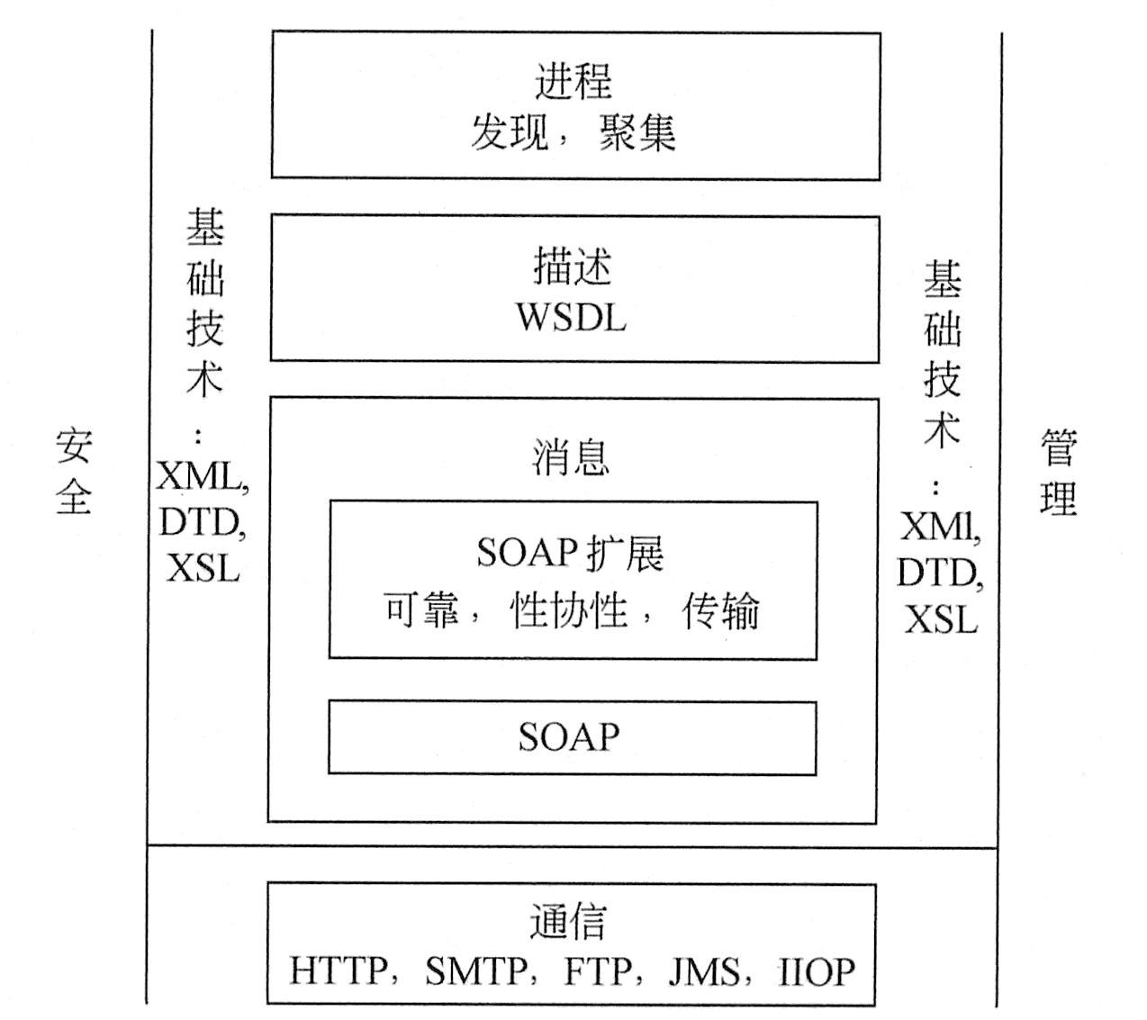 Web服务协议堆栈的下层为网络通信部分,Web服务继承了Web的访问方式,使用HTTP(S)作为网络传输的基础,除此之外Web服务还采用了其他的传输协议,如SMTP、FTP、JMS、HOP等。在消息处理方面,Web服务使用了SOAP(Simple Object Access Protocol,简单对象访问协议)作为消息的传送标准。在此之上是WSDL,用以描述Web服务的访问方法。位于最顶层的是与Web服务和应用程序以及Web服务之间相互集成相关的协议,其中包含发现、集成等若干方面。除了底层的传输协议外,整个Web服务协议栈是以XML为基础的,XML语义的精确性和灵活性赋予了Web服务强大的功能。除这些基本协议外,还有一些需要讨论的问题,那就是安全和管理,这两大问题不是Web服务可以独立解决的,例如,在安全方面就需要与PKI(Public Key Infrastructure,公共密钥基础设施)、LDAP(Lightweight Directory Access Protocol,轻量目录访问协议)等相结合。