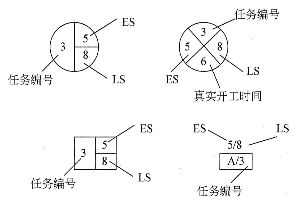 前导图法(Precedence Diagramming Method,PDM)也称为单代号网络图法(Active on the Node,AON),即一种用方格或矩形(结点)表示活动,并用表示依赖关系的箭线将结点连接起来的一种项目网络图的绘制法。在PDM中,每项活动有唯一的活动号,每项活动都注明了预计工期。每个结点的活动有最早开始时间(ES)、最迟开始时间(LS)、最早结束时间(EF)和最迟结束时间(LF)。PDM结点的几种表示方法如下图所示。