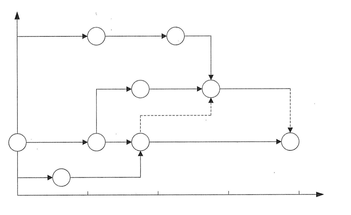 时标网络图(Time Scalar Network)克服了甘特图的缺点,用带有时标的网状图表示各子任务的进度情况,以反映各子任务在进度上的依赖关系。如下图所示,E2的开始取决于A3的完成。在下图中,虚箭头表示虚任务,即耗时为0的任务,只用于表示活动间的相互关系。