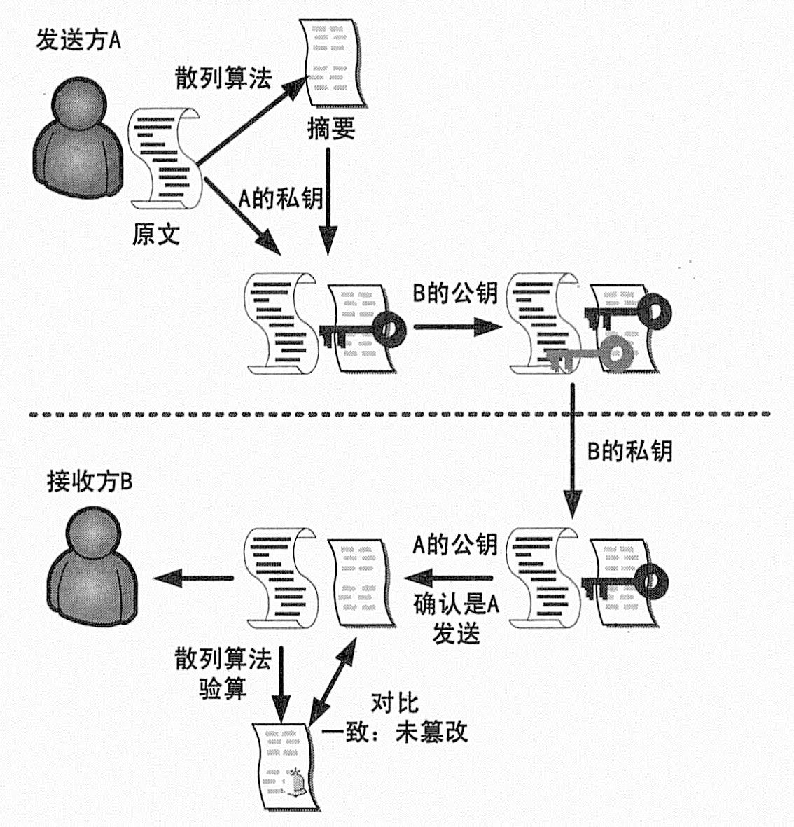 至此,整个通信过程也就完成了。需要注意的是,在实际的应用中,通常不会用A的私钥对原文进行加密,一方面是效率太低;另一方面是没有太大的必要,如下图所示。