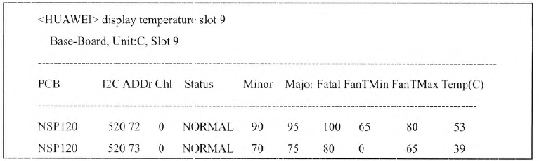 检查设备单板温度显示如下图所示,对单板温度正常的判断是(64),如果单板温度异常,首先应该检查(65)。