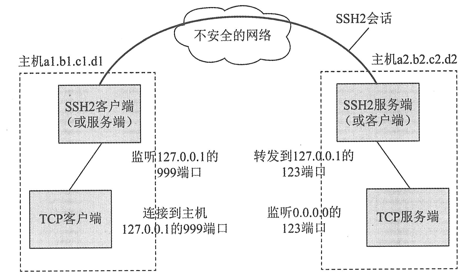 在实际的应用中,SSH在端口转发技术(如下图所示)的基础上,能够支持远程登录(Telnet)、rsh、rlogin、文件传输(scp)等多种安全服务。Linux系统一般提供SSH服务,SSH的服务进程端口通常为22。
