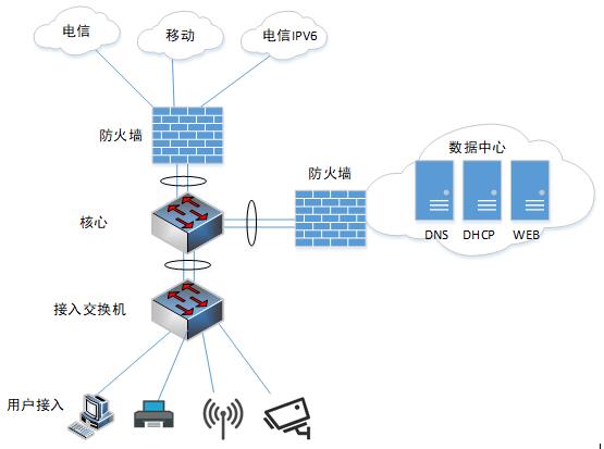 某单位计划对园区网进行升级改造,为响应国家政策要求相关业务支持IPv6访问。园区网出口包括:1Gbps电信IPv4、300Mbps移动IPv4、500Mbps电信IPv6。作为该单位网络管理员,结合单位需求进行了相关网络设计,拓扑如图2-1所示