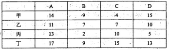 甲、乙、丙、丁4人加工A、B、C、D四种工件所需工时如下表所示。指派每人加工一种工件,四人加工四种工件其总工时最短的最优方案中..