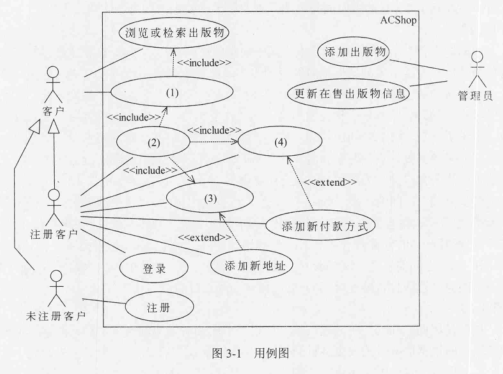 问题:3.1   据说明中的描述,给出图3-1中(1)~(4)所对应的用例名。