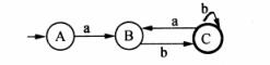 某确定的有限自动机(DFA)的状态转换图如下图所示(A是初态,C是终态),则该DFA能识别(49)。