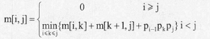 两个矩阵Am*n和Bn*p相乘,用基本的方法进行,则需要的乘法次数为m*n*p。多个矩阵相乘满足结合律,不同的乘法顺序所需要的乘法次数不同。考虑采用动态规划方法确定Mi,M(i+1),…,Mj多个矩阵连乘的最优顺序,即所需要的乘法次数最少。最少乘法次数用m[i,j]表示,其递归式定义为: