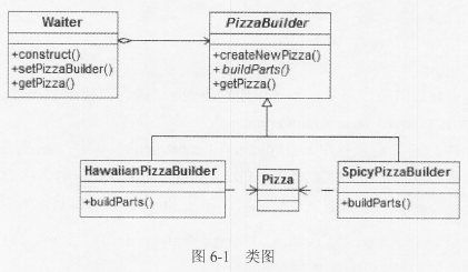 某快餐厅主要制作并出售儿童套餐,一般包括主餐(各类比萨)、饮料和玩具,其餐品种类可能不同,但其制作过程相同。前台服务员(Waiter) 调度厨师制作套餐。现采用生成器(Builder) 模式实现制作过程,得到如图6-1所示的类图