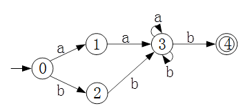 某确定的有限自动机(DFA)的状态转换图如下图所示(0是初态,4是终态),则该DFA能识别( )。