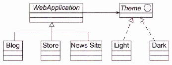 假设现在要创建一个Web应用框架,基于此框架能够创建不同的具体Web应用,比如博客、新闻网站和网上商店等;并可以为每个Web应用创建不同的主题样式,如浅色或深色等。这一业务需求的类图设计适合采用(45)模式(如下图所示)。其中(46)是客户程序使用的主要接口,维护对主题类型的引用。此模式为(47),体现的最主要的意图是(48)。
