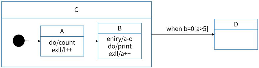 当UML状态图用于对系统、类或用例的动态方面建模时,通常是对(45)建模。以下UML状态图中,假设活动的状态是A,事件b=0发生并且a>5,发生条件是c状态到d状态的转换条件的是(46),D变为活动的状态,有关状态图的叙述中,不正确的是(47)。
