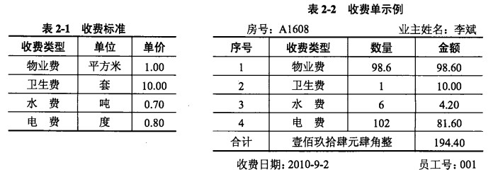 (4)收费信息包括:房号、业主编号、收费日期、收费类型、数量、收费金额、员工号等。收费类型包括物业费、卫生费、水费和电费,并按月收取,收费标准如表2-1 所示。其中:物业费=房屋面积(平方米)X每平方米单价,卫生费=套房数量(套)X 每套房单价,水费=用水数量(吨)X每吨水单价,电费=用电数量(度)X每度电单价。