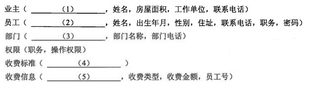 (1)业主信息主要包括:业主编号、姓名、房号、房屋面积、工作单位、联系电话等。房号可唯一标识一条业主信息,且一个房号仅对应一套房屋;一个业主可以有一套或多套的房屋。