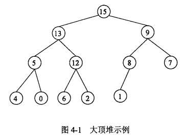 在一个堆中,若堆顶元素为最大元素,则称为大顶堆;若堆顶元素为最小元素,则 称为小顶堆。堆常用完全二叉树表示,图4-1是一个大顶堆的例子。