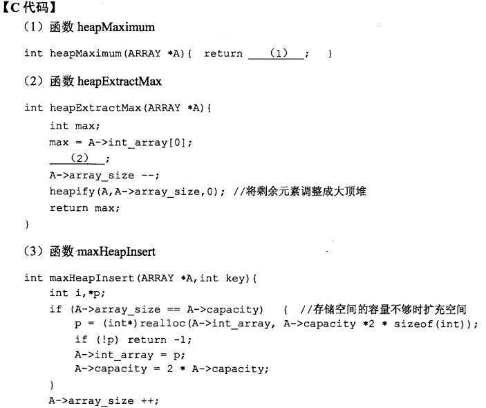 问题:4.2   根据以上 C 代码,函数heapMaximum、heapExtractMax 和maxHeapInsert 的时间复杂度的紧致上界分别为 (6) 、 (7) 和(8)(用O符号表示)。