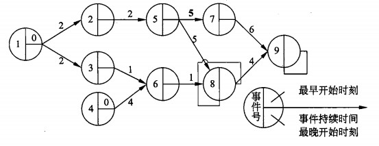 PERT图是一个有向图,箭头表示任务,它可以表示完成该任务所需的时间;箭头指向节点表示流入节点的任务的结束,并开始流出节点的任务,这里把节点当成事件。只有当流入该节点的所有任务都结束时,节点所表示的事件才出现,流出节点的任务才可以开始。事件本身不消耗时间和资源,它仅表示某个时间点。一个事件有一个事件号和出现该事件的最早时刻和最迟时刻。每个任务还有一个松弛时间,表示在不影响整个工期的前提下,完成该任务有多少机动余地。