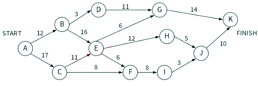 在实际解答试题时,一般所给出的活动数并不多,我们可以采取观察法求得其关键路径,即路径最长的那条路径就是关键路径。
