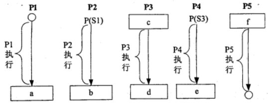 若用PV操作控制进程P1、P2、P3、P4和P5并发执行的过程,则需要设置5个信号S1、S2、S3、S4和S5,且信号量S1~S5的初值都等于零。下图中a和b处应分别填(26);c和d处应分别填写(27);e和f处应分别填写(28)。