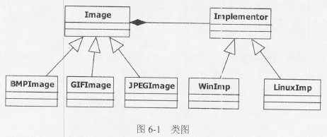 某图像预览程序要求能够查看BMP、JPEG和GIF三种格式的文件,且能够在Windows和Linux两种操作系统上运行。程序需具有较好的扩展性以支持新的文件格式和操作系统。为满足上述需求并减少所需生成的子类数目,现采用桥接模式进行设计,得到如图6-1所示的类图。