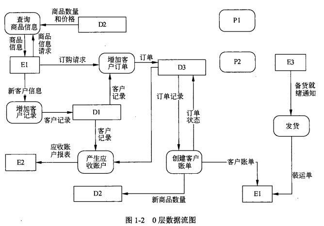 (1)给出图1-2中处理(加工)P1和P2的名称及其相应的输入输出流。 (2)除加工P1和P2的输入输出流外,图1-2还缺失了1条数据流,请给出其起点和终点。