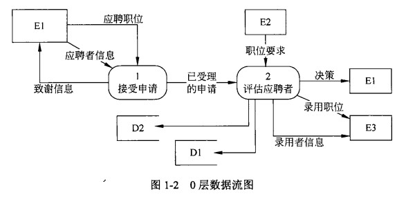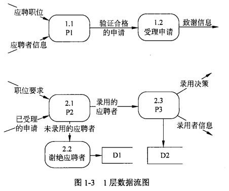 某公司欲开发招聘系统以提高招聘效率,其主要功能如下: (1)接受申请 验证应聘者所提供的自身信息是否完整,是否说明了应聘职位,受理验证合格的申请,给应聘者发送致谢信息。 (2)评估应聘者 根据部门经理设置的职位要求,审查已经受理的申请;对未被录用的应聘者进行谢绝处理,将未被录用的应聘者信息存入未录用的应聘者表,并给其发送谢绝决策;对录用的应聘者进行职位安排评价,将评价结果存入评价结果表,并给其发送录用决策,发送录用职位和录用者信息给工资系统。 现采用结构化方法对招聘系统进行分析与设计,获得如图1-1所示的顶层数据流图、图1-2所示0层数据流图和图1-3所示1层数据流图。