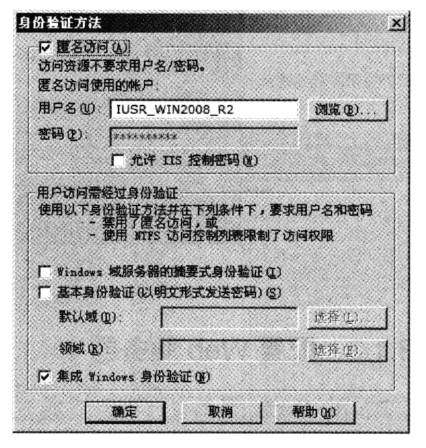 选中"启用匿名访问"复选框可以为用户建立匿名连接,此时用户无须专用的账户,而是使用匿名或来宾账户(Guest)登录到IIS。默认情况下,服务器创建和使用账户"IUSR_计算机名",对应于本书所举的例子,用户名为IUSR_WIN2008_R2。