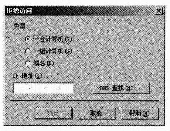 用户可以基于IP地址或域名来允许或拒绝特定用户、计算机、计算机组或域访问该网站、目录或文件。在上图所示的"IP地址和域名限制"选项组中单击"编辑"按钮,打开如下图所示的"IP地址和域名限制"对话框。默认情况下,所有的计算机都被允许访问该网站。选中"授权访问"单选按钮,可以授权所有的计算机访问该网站,但在"下列除外"列表框中指定的计算机除外。要添加拒绝访问的计算机、计算机组或域,需单击"添加"按钮,打开如下图所示的"拒绝访问"对话框,在其中输入希望拒绝计算机的相应信息。输入后,单击"确定"按钮,被拒绝访问的计算机将出现在如下图所示的"下列除外"列表框中。