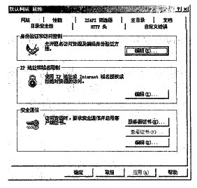 为了保证Web网站和服务器的安全,可以在"目录安全性"选项卡中为网站进行身份验证和访问控制、IP地址和域名限制的设置,如下图所示。在"身份验证和访问控制"选项组中单击"编辑"按钮,打开如下图所示的"身份验证方法"对话框。使用该对话框可以配置Web服务器以验证用户身份。可以验证单个用户或选择用户组来阻止未授权用户与受限制内容建立Web(HTTP)连接。