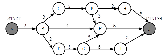 某软件项目的活动图如下图所示,其中顶点表示项目里程碑,连接顶点的边表示包含的活动,边上的数字表示活动的持续时间(天)。完成该项目的最少时间为(7)。由于某种原因,现在需要同一个开发人员完成BC和BD,到完成该项目如最少时间为(8)天。