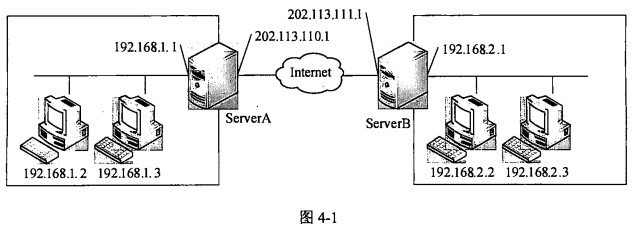 某企业在公司总部和分部之间采用两台Windows Server 2003服务器部署企业IPSec VPN,将总部和分部的两个子网通过Internet互联,如图4-1所示。