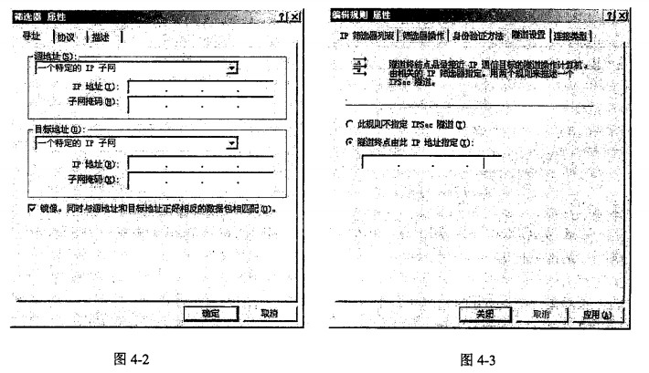 设置ServerA和ServerB之间通信的筛选器属性界面如图4-2所示,在ServerA的IPSec安全策略配置过程中,当源地址和目标地址均设置为“一个特定的IP子网”时,源子网IP地址应设为(7),目标子网IP地址应设为 (8) 。图4-3所示的隧道设置中的隧道终点IP地址应设为 (9)。