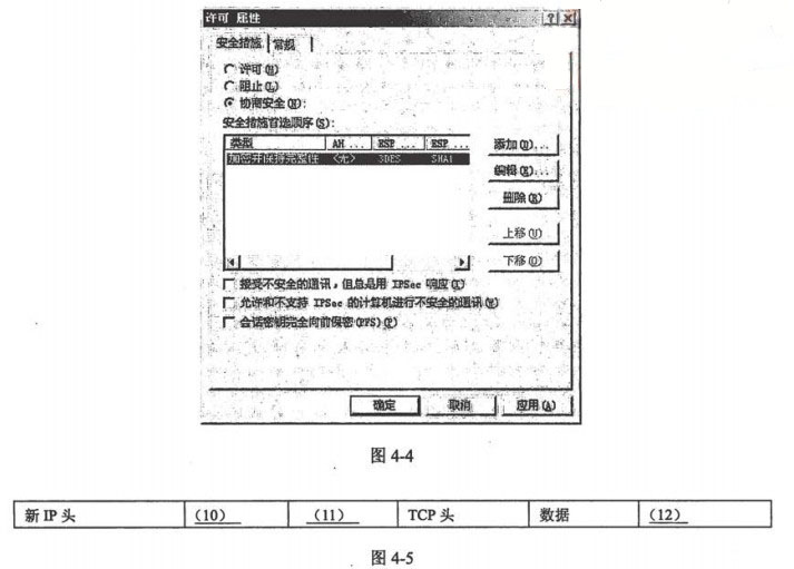在ServerA的IPSec安全策略配置过程中,ServerA和ServerB-之间通信的IPSec筛选器“许可”属性设置为“协商安全”,并且安全措施为“加密并保持完整性”,如图4-4所示。根据上述安全策略填写图4-5中的空格,表示完整的IPSec数据包格式。